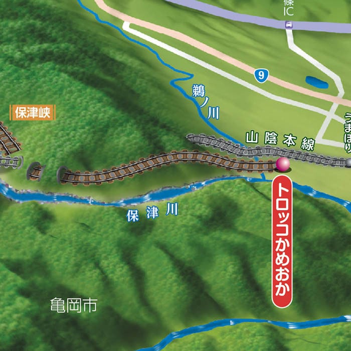 保津川に沿って京都の山間部を縫うように走る様子がよくわかる鉄道鳥瞰図です。