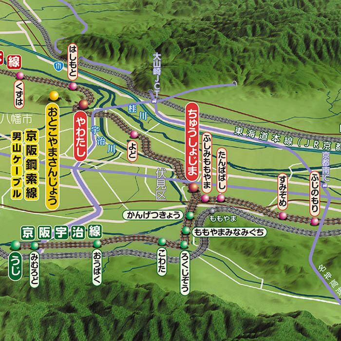 大阪から淀川・宇治川・鴨川に沿って京都まで走る様子がよくわかる鉄道鳥瞰図です。